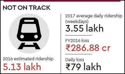 Apart from ridership, high finance costs of Rs 212.25 crore — which exceeded the revenues of Rs 210.23 — and high operating cost of Rs 105.23 crore also impacted the financials. The company’s cash reserves and surplus worsened from a deficit of Rs 279.83 crore in FY15 to Rs 566.71 crore in FY16.