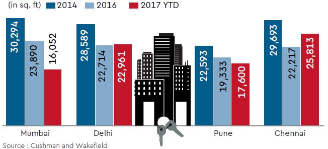Over the last three years, average commercial deal sizes across Indian cities have been heading south. If it is at a jaw-dropping 47% in Mumbai, from 30,294 lakh sq ft in 2014 to 16,052 lakh sq ft in 2017, Pune has logged in a 22% decline, from 22,593 sq ft to 17,600 sq ft, over the same time frame. Likewise, in Delhi, the average plummeted to 20%, from 28,589 sq ft to 22, 961 sq ft, and in Chennai, the deal size diminished 25%, from 29,693 sq ft to 22,217 sq ft. So far, Bengaluru, which contributes most heavily to annual leasing in the country, seems insulated. With the average ticket size of office leasing in Mumbai falling by more than 30% in the last one year, industry observers mull over both cultural and market rationale for the overall countrywide dip.