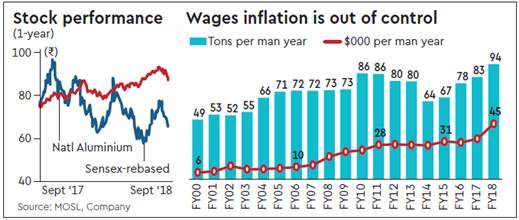 Nalco has advantage of captive bauxite mines, coal linkage and logistics due to strategic locations. However, its wage bill keeps growing unfettered every year without corresponding improvement in productivity. Employee wages now account for more than $500/t in metal CoP (cost of production), which is the highest in the world. Although, total headcount declined 2% to 6,776, average recurring annual wages per employee increased 32% to Rs 2.9m – the highest in Indian metal and mining industry.