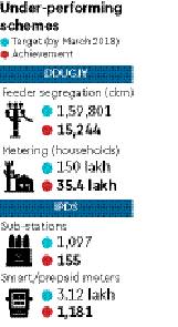 For instance, under the Deendayal Upadhyaya Gram Jyoti Yojana (DDUGJY), which was launched in July 2015 with an objective to improve rural electrification, only 15,244 circuit km (ckm) of feeder segregation has been achieved so far, while the target was to put in place 1.6 lakh ckm before the start of 2018-19. Feeder segregation is meant to prevent misuse of subsidised agricultural power supply and improve the distribution companies’ aggregate technical and commercial (AT&C) losses. Only 35.4 lakh out of the 150 lakh DDUGJY consumers have been metered so far, and a mere 215 new sub-stations have been constructed versus a target of 1,825.