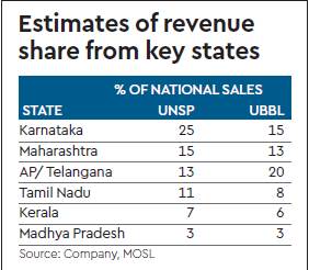 The state likely accounts for only 2-3% of sales for UNSP and UBBL. Tamil Nadu (a far more important market for both these companies) had also announced prohibition last year, but only 10% of outlets have been closed. Kerala is in the process of repealing the liquor ban. Liquor prohibition has not lasted for more than two years in any Indian state other than Gujarat. This may be primarily because alcohol contributes more than 25-40% of revenues for most states.