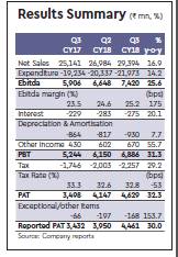 Q3CY18 revenues of Rs 29.4 bn (17%, is an acceleration from the c14.5% in Q2). There is a clean beat (vs. ests) of 4-5% on all lines of the P&L –revenue, Ebitda and PAT, with the revenue growth driving operating leverage. Ebitda margin of 25.2% is up 175bps. PAT of Rs 4.46 bn rose 30%.