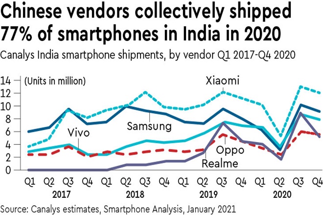 The ongoing border tensions and the anti-China sentiment in India have failed to check the dominance of Chinese handset makers, who controlled a whopping 77% of the total 145 million smartphones shipped during the last calendar year. Analysts expect that as India prepares for 5G, these brands are expected to increase their influence in the domestic market in 2021.