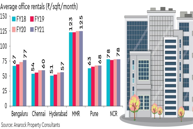 The MMR witnessed just 2% growth in average office rentals between FY18 and FY21 — from Rs 123 per sq ft per month in FY18 to Rs 125 in FY21. Delhi NCR remained flat at Rs 78 per sq ft in both years.