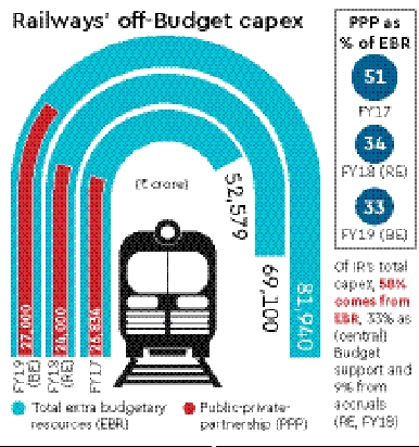 Indian Railways (IR) may be making all the right noises about public-private partnerships (PPPs) in railway projects (expert committees had pitched for broad-basing PPPs, having private train operators paying rentals to IR for track access, proposals which haven’t materialised), but the share of PPPs in extra-budgetary resources (EBR) has declined from 51% in 2016-17 to 33% in 2018-19 (budget estimate). This is even as EBRs have become the mainstay of railway capex over the last few years, as support from the central Budget stagnated. EBRs increased from 47% of capex in 2016-17 to 56% in 2018-19 (BE).