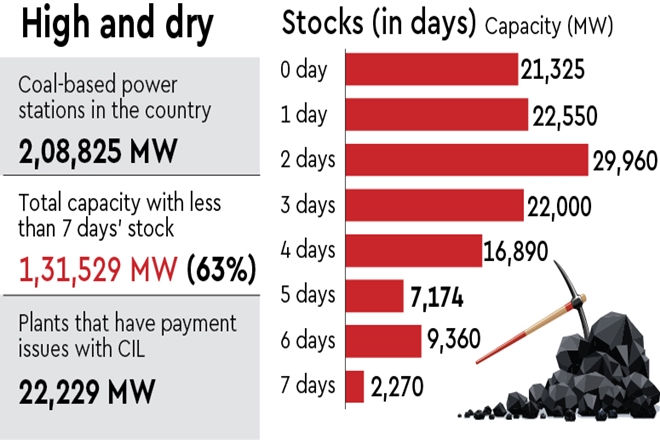 Coal-fired power stations, which produce over 70% of the electricity consumed in the country. had an average of four days’ fuel stock at September -end, down from 13 days at the start of August. As on October 3, around 132 giga (MW) of power generation capacity had fuel stocks at critical levels.