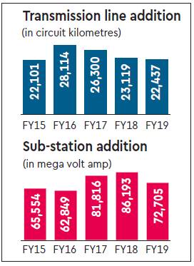 Similarly, the addition of 72,705 mega volt amp (MVA) of sub-stations commissioned in FY19 is about 16% lower than that in the previous fiscal, and the slowest pace recorded since FY16. Contrary to their state-run counterparts, the private sector players have laid down 66% more transmission lines year-on-year (y-o-y) by commissioning 3,840 ckm in FY19.