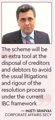 The planned scheme, if implemented, will be a “pre-IBC (Insolvency and Bankruptcy Code) window for the resolution of stressed assets, which will complement the existing framework and not substitute it,” corporate affairs secretary Injeti Srinivas told FE on Monday. The secretary has asked the Insolvency and Bankruptcy Board of India to weigh the proposal and see if it can be adopted.