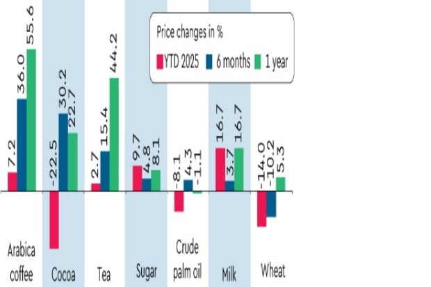 Titanium dioxide, meanwhile, goes into paints and LAB & soda ash are used in detergents.In the last six months, cocoa and Arabica coffee prices have seen a sharp uptick of 30-36%; copra and tea have risen by 15%, Robusta coffee is up 13.4% and crude palm oil has increased by 4.34%, Bloomberg data show.
