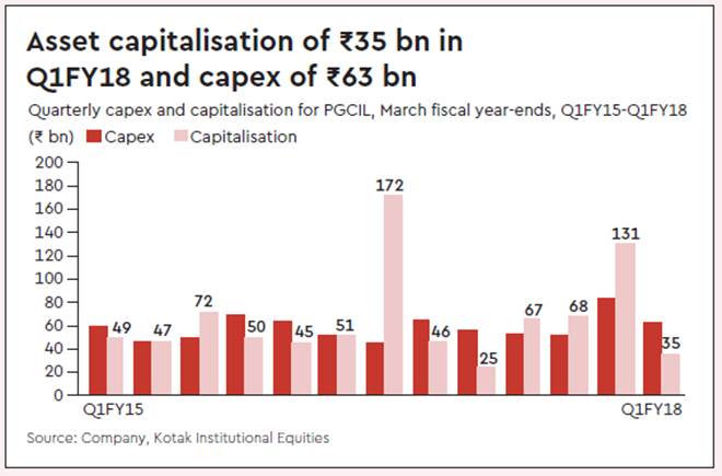 PWGR capitalised assets aggregating Rs 35 bn during the quarter besides incurring large capex of Rs 65 bn. At the end of March 2017, we estimate PWGR to have a gross block of Rs 1.9 trn, and CWIP of Rs 477 bn. We highlight that PWGR commissioned 1,083 cktkms of transmission lines and 4,500 MVA of substations in Q1FY18, compared to 11,669 cktkm and 35,435 MVA of transmission lines and substations in FY2017.