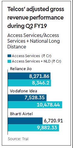 As per Trai data released on Saturday, during the July-September 2018 quarter, Jio’s AGR for access services stood at Rs 8,271.86 crore, higher than VIL’s Rs 7,528.35 crore and Bharti’s Rs 6,720.91 crore.