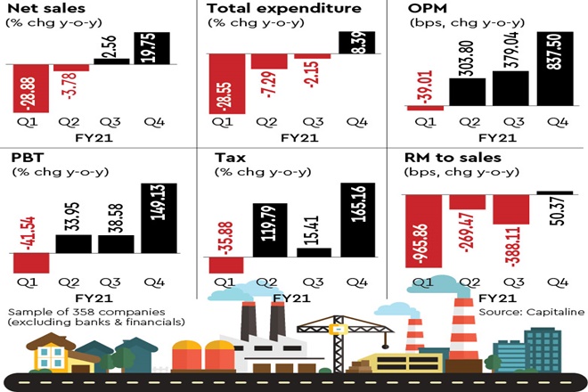 Revenues at Maruti Suzuki increased by 32% y-o-y led by a big jump in volumes and a 4.5% y-o-y increase in ASPs (average selling price). Discounts on vehicles have come down significantly to Rs 16,600 per vehicle in 4QFY21 versus Rs 19,051 in 4QFY20 as demand has picked up. Standalone revenues at Ultratech Cement increased a smart 35% y-o-y with sales volume up 30% y-o-y and capacity utilization hitting 93% y-o-y.