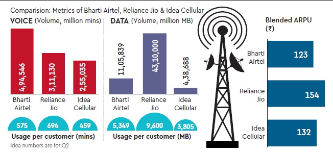 Similarly, Jio’s data traffic at 431,00,00 million Mbs was much higher than Bharti’s 110,58,39 million Mbs. Jio’s data volume compared to the preceding quarter increased by 14%. Data usage per customer though was a tad lower at 9600 MB compared with 9620 MB in the preceding quarter. Still, it was the highest in the industry as Bharti’s usage per customer stood at 5349 MB. On total voice traffic though, Jio with 311,130 million minutes is lower than Bharti’s 494,546 million minutes. However, on its own, Jio registered an increase of 30% compared to the preceding quarter. However, usage per customer of Jio’s was higher at 694 minutes, compared with Bharti’s 575 minutes. Here Jio registered a growth of 11% sequentially. Jio’s monthly churn, though the lowest in the industry, increased to 1.4% per month during the quarter compared with 1% in the preceding quarter. Bharti had registered a decline in churn during the December quarter.