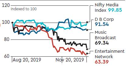 The Nifty Media index — the worst-performing sectoral index on the NSE — has lost 27.4% so far in 2019. The share prices of ENIL and DB Corp have declined 61.3% and 14.6%, respectively, between January and now. DB Corp operates My FM brand of radio stations. ENIL, Music Broadcast and DB Corp jointly operate 142 stations across the country.
