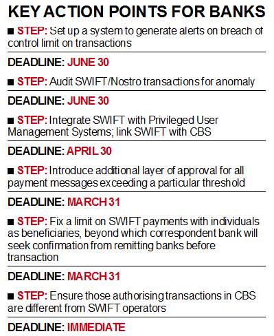 The central bank has directed all banks to implement as many as 29 measures — from creating an alert system by June 30 on breach of any control limits to linking of SWIFT system (which was abused by some PNB employees causing the fraud) with Privileged User Management Systems as well as core banking solutions (CBS) — within set deadlines.