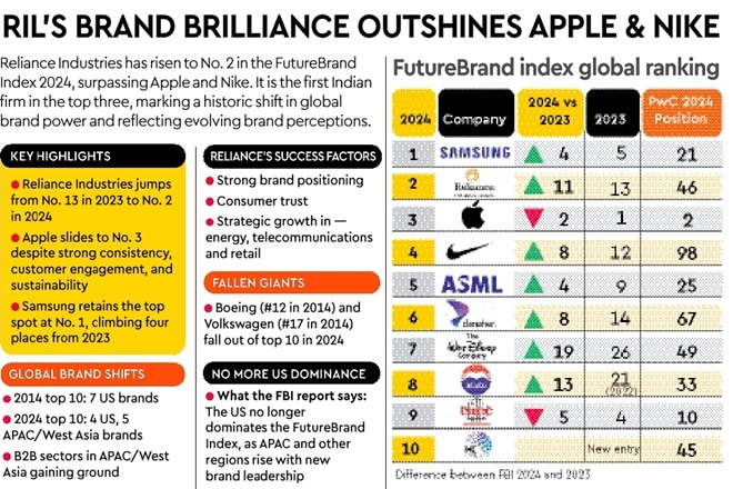 In a coup of sorts, Reliance Industries Limited (RIL) has broken into the No. 2 spot in the FutureBrand Index 2024, surpassing global technology giant Apple. This is the first time an Indian company appears among the top three of the Index, which evaluates companies based on brand perception rather than financial performance.