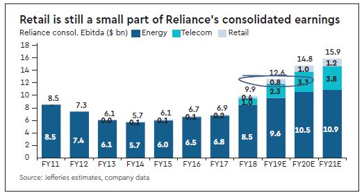 Retail: Reliance’s success in mobile wireless has been the key tailwind for its shares but retail has also grown in salience with quarterly Ebitda trebling over the past year.