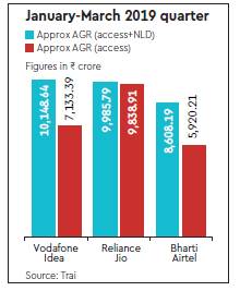 After analysing data for the past four quarters, it is seen that Reliance Jio’s AGR from access and NLD services has increased from about `7,200 crore in April-June 2018 to over `9,985 crore in January-March 2019, while that of Bharti Airtel has declined from about `10,192 crore to `8,608 crore in the same period.