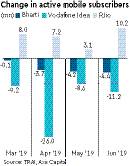 It lost 4.4 mn active subscribers vs. loss of 4.2 mn subscribers in May 2019. Active SMS was down 26 bps (down 9 bps m-o-m in May 2019) to 32.1%. It had a peak active SMS of 34.3% in June 2018. Bharti reported subscriber base was largely unchanged in June. Losses in active subscribers were higher as VLR declined from 99.9 in May to 98.5 in June.