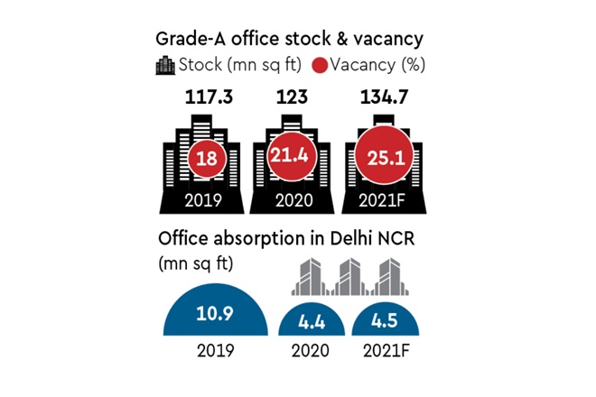 The demand for office spaces in Delhi NCR is expected to remain flat at 4.5 million sq ft (MSF) in 2021 compared to the year-ago period as occupiers will continue to adopt a cautious approach and focus on reassessing their real estate portfolio, Savills India said.