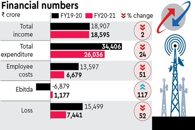 State-owned BSNL has managed to reduce its losses by more than 50% at Rs 7,441 crore in FY21 after its wage bill came down by around 51% at Rs 6,679 crore. This was due to a voluntary retirement scheme undertaken by the company following a revival package offered by the government in October 2019.