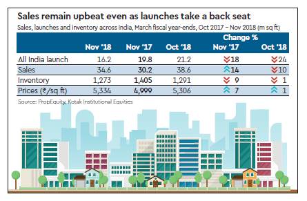 According to Kotak Institutional Equities estimates, launches fell by 18% y-o-y to 16.2 million sq ft in November 2018, against 19.8 million sq ft during the same month last year and were significantly lower than 21.2 million sq ft in October 2018. Launches in tier-II cities dropped to 1.4 million sq ft against average monthly launches of 2.4 million sq ft in the first half of the financial year 2019.