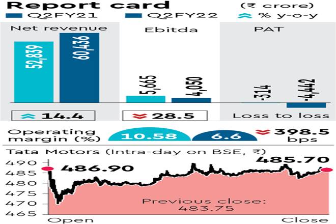 Tata Motors on Monday posted a consolidated net loss of Rs 4,415.47 crore during the July-September quarter, wider than Rs 307.26 crore a year ago as the company was impacted by semiconductor shortage and rising input costs. A Bloomberg consensus estimate had pegged the company’s net loss at Rs 3,681-crore.