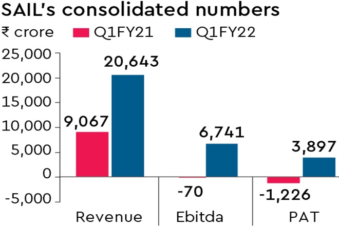 Ebitda for the April-June quarter of the current fiscal stood at Rs 6,741 crore. SAIL’s Ebitda was (-) Rs 70 crore in the same quarter a year earlier.
