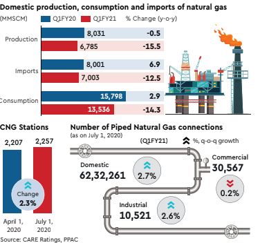 The gross production of gas is expected to fall by 10.6% during FY21, CARE Ratings has said–production fell by 5.9% during FY20 and 0.7% during FY19.