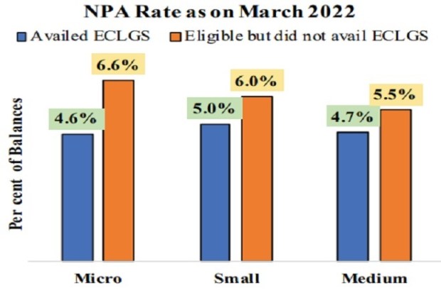 In the micro segment, units that availed ECLGS had an NPA rate of 4.6 per cent vis-a-vis 6.6 per cent among those units that didn’t avail it. Similarly, among small businesses, the NPA rate for enterprises that availed the scheme was 5 per cent against 6 per cent who didn’t avail it. Among medium enterprises, the NPA rate was 4.7 per cent for enterprises availing the scheme versus 5.5 per cent who were eligible but didn’t opt for it.