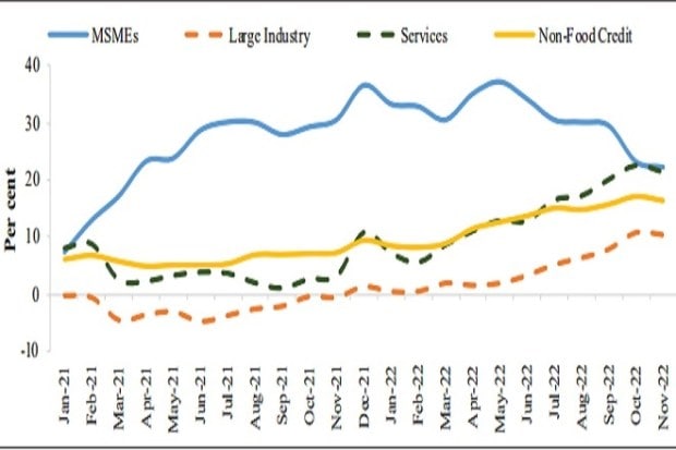 Credit growth to the MSME sector grew from less than 10 per cent during January 2021 to over 35 per cent during December 2021 but dropped to around 20 per cent as of November 2022, the data in the survey sourced from the Reserve Bank of India (RBI) showed.