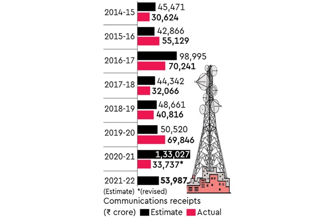 The realistic assessment of telecom receipts for FY22 comes after the overambitious budgetary target fixed for the current fiscal at Rs 1.33 lakh crore. Either, the government had hoped that the massive adjusted gross revenue (AGR) dues of the operators (which they were required to pay as per the Supreme Court order in October 2019) would come in one go or it expected to conduct auctions in the current fiscal from which it may have expected too high a sum.