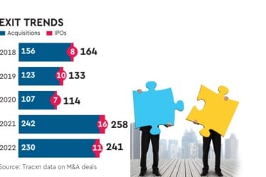 Neha Singh, co-founder and CEO of Tracxn, said despite a stalled year for funding, investor exits improved by a large margin in CY2022 in comparison to the past couple of years, largely due to a spike in M&As and domestic IPOs. “While a majority of the M&As last year were made due to the high availability of cash among large unicorns and tech companies, this year it is different. Some of these M&As in 2022 have been a survival tactic, especially for smaller companies that got acquired due to the ongoing funding crunch,” Singh added.