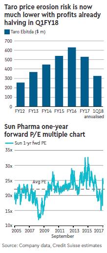 Price erosion risk at Sun to be lower at mid-single digit while industry faces higher risk: We stay negative on the US generic market, and expect high single-digit price erosion. However, for Sun we lower price erosion to mid-single digit (and increase FY19 EPS by 5%) as (i) Taro’s Ebitda has already halved (from FY16) and product concentration is also lower now, and (ii) Ex-Taro US sale has already seen an erosion of 34% in the last two quarters and 55% of the remaining sale is immune to the price erosion risk.