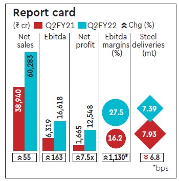 The company’s net sales for the period increased 55% year-on-year to Rs 60,283 crore. Steel deliveries declined nearly 7% y-o-y during the quarter to 7.39 million tonne. Sales volume of the automotive segment increased by 18% sequentially, despite the semiconductor shortage driven weakness in the sector.