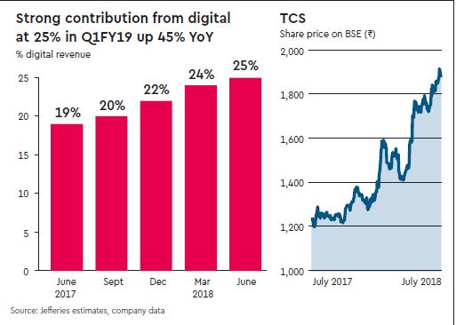 We raise our price target for TCS to Rs 2,140 (prev. Rs 1,600) based on 22x (19x prev.) 12m forward EPS as of Jul-19 and upgrade the stock to Buy (from Hold). We believe valuation premium to peers is justified by better growth visibility/outlook as it is the only Tier-1 IT company in our coverage with double-digit growth over FY19-21e. High FCF/dividend yield, USD exposure and sector leadership support valuation on an absolute basis.