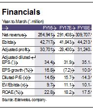 With sustenance of enterprise business’ robust revenue momentum, growth revival in telecom is likely to lead to industry-leading growth. Further, with all headwinds behind it and sustained margin improvement, we estimate TECHM to comfortably post EPS CAGR of 10.6% over FY17-19. The stock currently trades at 12.8x FY19e EPS. We retain ‘BUY/SP’ with target price of `546 (14x FY19E EPS).