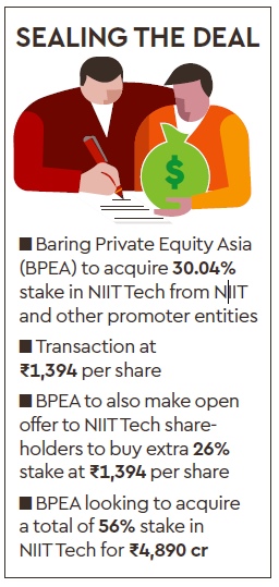 Baring Private Equity Asia is set to acquire a 30.04% stake in IT solutions firm NIIT Technologies from NIIT and other promoter entities at Rs 1,394 per share, which will take the transaction cost to Rs 2,627 crore, according to a statement released by the firm to the stock exchanges on Sunday.  NIIT Tech and other promoter entities will be selling 1.885 crore shares as part of this transaction.
