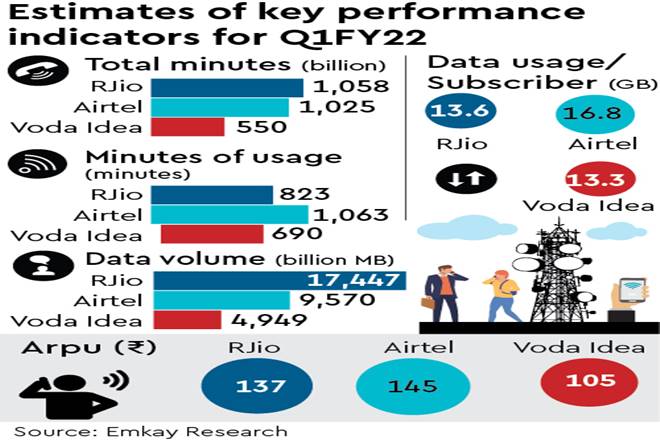 Bharti Airtel is expected to report Arpu in the range of Rs 146-148 seeing a flat to 1.8% increase quarter-on-quarter. However, according to IIFL, Bharti’s Arpu could decline much more to about Rs 140 impacted adversely by slowdown in 2G to 4G upgrade cycle due to lower smartphone shipments. Vodafone Idea is expected to report Arpu in the range of Rs 104-106 in Q1FY22, a decline of 1-3% versus Q4FY21. Reliance Jio, according to analysts will see a q-o-q increase in Arpu to Rs 139-140 compared to Rs 137 in the preceding quarter. However, IIFL and Emkay Research estimate Jio’s Arpu to decline 1-2.3% sequentially.
