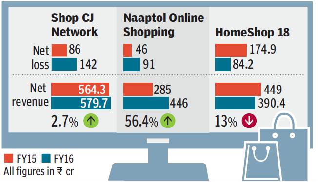 Losses at Shop CJ Network widened to Rs 142 crore in FY16 from Rs 86 crore in FY15 while revenues rose marginally by 2.7% to Rs 579.74 crore.Network18 Group’s Homeshop18 too posted losses of Rs 84.2 crore in FY16, although these were smaller than the losses of Rs 174.9 crore in FY15. The company saw a 13% drop in revenues to Rs 390.4 crore in FY16.