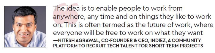 By hiring freelancers, companies are benefitting, as they can now outsource some activities. When Jubilant FoodWorks, which holds the master franchise for Domino’s Pizza in India, Nepal, Sri Lanka and Bangladesh, and also for Dunkin’ Donuts in India, had to make its mobile app more user-friendly, it contacted online portal Indiez, which specialises in providing technology solutions. “We are a global community of the top 1% software freelancers,” says Nitesh Agrawal, co-founder and CEO, Washington-based Indiez, which built the Domino’s Pizza mobile platform using its tech members. “The idea was to enable people to work from anywhere, any time and on things they like to work on. This is often termed as the future of work, where everyone will be free to work on what they want,” he says.