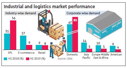 Warehouse leasing by corporates rose a healthy 31% Y-o-Y to surpass 13 million sq ft during the first half of the 2019 calendar year (CY), with Mumbai, Chennai and Bangalore accounting for more than 60% of the activity. The demand during the period was mainly driven by third-party logistics (3PL) players, followed by e-commerce companies.