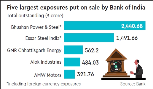 BoI has also put on the block a bunch of exposures to companies named on the central bank’s second list, including Asian Colour Coated Ispat (Rs 191 crore), Jai Balaji Industries (Rs 124 crore), Orchid Chemicals and Pharmaceuticals (Rs 340 crore), Uttam Galva Steel (Rs 199 crore), Visa Steel (Rs 67 crore) and Wind World (India) (Rs 126 crore). Also on the list is GMR Chhattisgarh Energy (Rs 562 crore), which is one of the 11 large power accounts lenders and power producers are trying to resolve, and Binani Cement (Rs 61 crore).