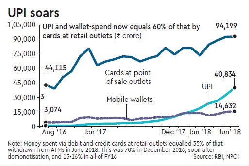 Add mobile wallets, and the share of non-card digital payments (UPI + wallets) rose even more, to 58.9% in June 2018 as compared to 11.5% in June 2017.