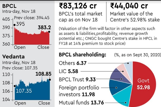 Seven-and-a-half months into the fiscal, the Centre is now making a determined effort to sell its stake in BPCL, which was worth Rs 44,040 crore at Wednesday’s closing price on the BSE. The government’s stake in BPCL was worth about Rs 60,000 crore in November 2019, around the time the stake sale proposal was approved by the Union Cabinet.