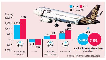 Net losses at Tata Sons and Singapore Airlines joint venture Vistara nearly doubled to Rs 831 crore in 2018-19 on account of costlier fuel and weaker rupee. The airline had reported a net loss of Rs 419 crore in FY18 while its losses in FY17 stood at Rs 518 crore, according to the data sourced from the Ministry of Corporate Affairs.