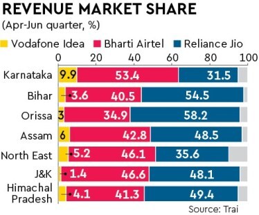 The telco’s revenue market share in Karnataka, Bihar, Orissa, Assam, North-East, Himachal Pradesh and Jammu & Kashmir is now in the range of 1.4-9.9%, while the same for Jio and Bharti is in the range of 31.5-58.2%.