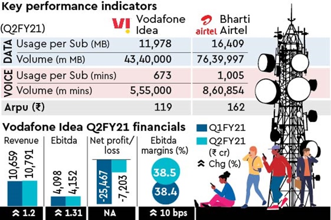 The company’s total minutes of usage on the network during the quarter stood at 5,55,000 million minutes, a decline of 4% q-o-q, while the average minutes per user at 673 minutes remained flat sequentially. After registering good growth in data volumes in the last two quarters, VIL reported a 4% decline in data volumes which stood at 43,40,000 million MB. The company said it was on account of data usage normalisation compared with the significantly higher volumes witnessed during the early months of lockdown. Data usage per broadband subscriber fell a sharp 9% q-o-q at 11,978 MB per month, which was much lower compared with Airtel’s data usage per subscriber of 16,409 MB.