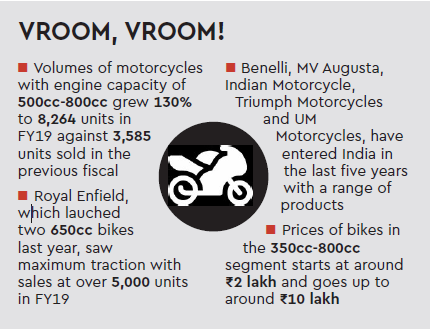 As per Society of Indian Automobile Association (SIAM) data, volumes of motorcycles with engine capacity of 500cc-800cc grew 130% to 8,264 units in FY19 against 3,585 units sold in the previous fiscal. The actual number could be even higher as some companies, including Benelli, MV Augusta and UM Motorcycles, are not listed with the auto industry body as of now. Royal Enfield, which lauched two 650cc bikes last year, saw maximum traction with sales at over 5,000 units in FY19. The bikes are priced in the range of Rs 2.5 lakh to Rs 3 lakh.