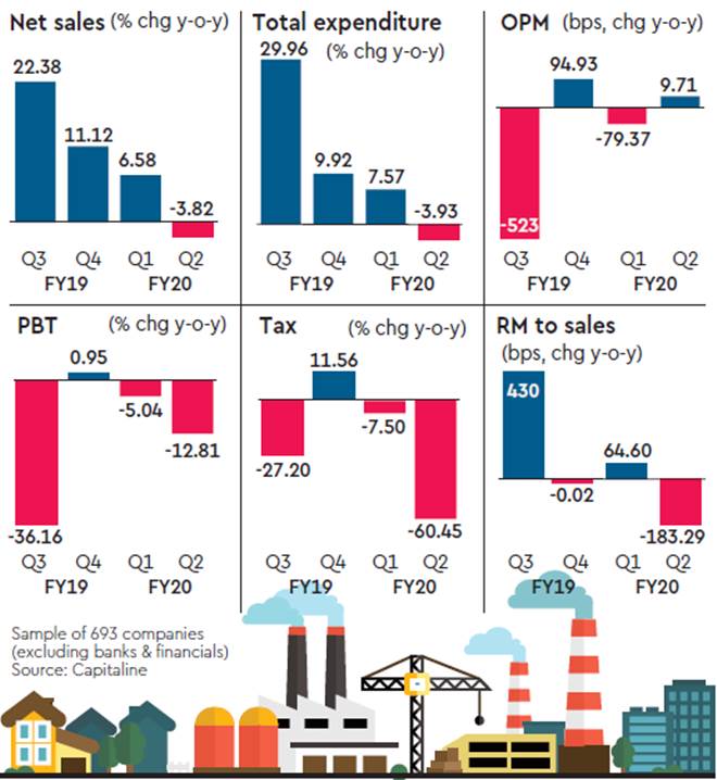 India Inc continues to be under pressure with the July-September quarter earnings throwing in disappointing numbers. Net sales during the quarter were down 3.82% year-on-year in the absence of weak volumes and lack of pricing power. If the net profit for a sample of 693 companies (excluding banks and financials) was up 7.65% y-o-y, it was due to lower expenses, which fell 3.93% due to lower raw material bill.